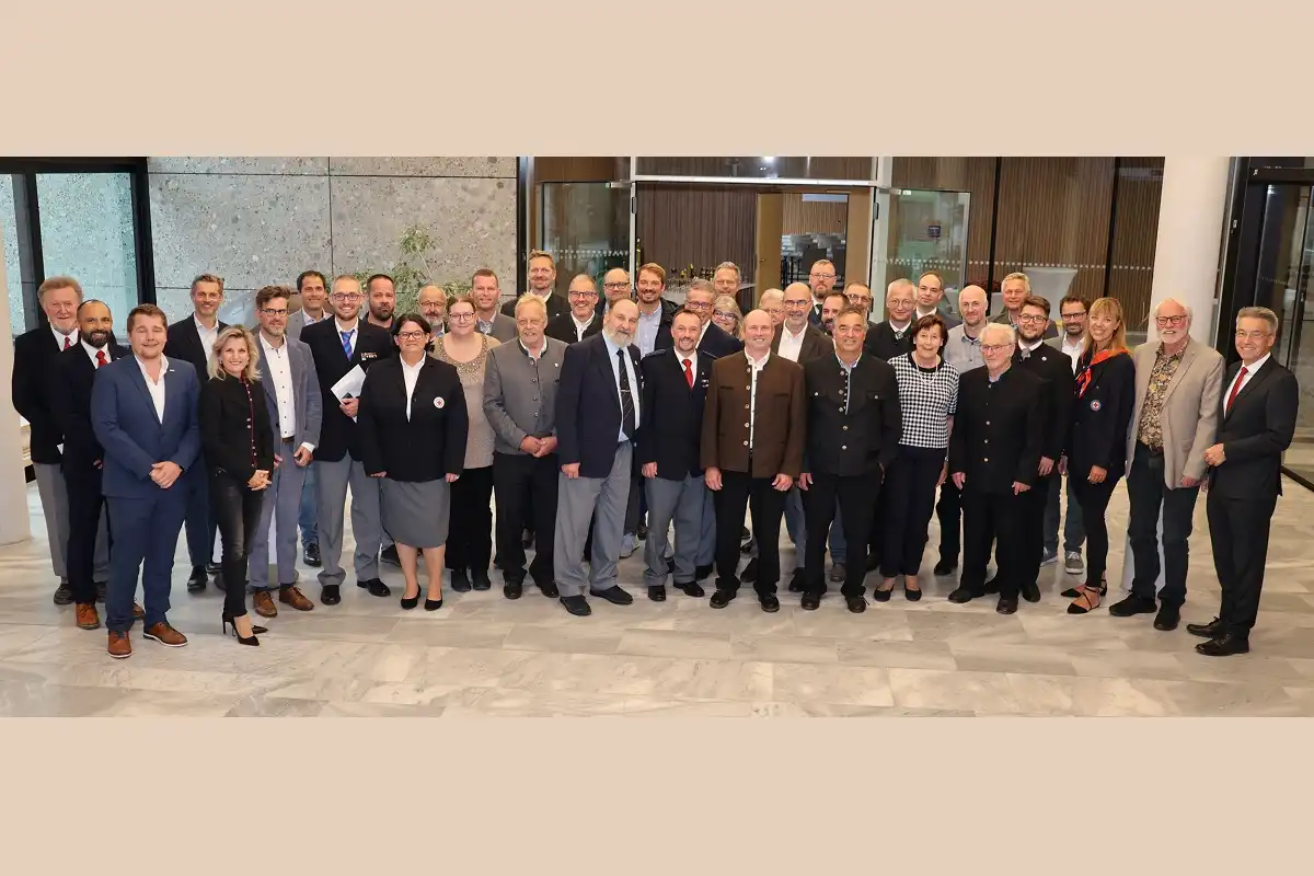 Mit einer feierlichen Zeremonie im Landratsamt sind am Montag (29.09.2025) im Landratsamt 21 Ehrenamtliche für ihre langjährigen Verdienste beim Bayerischen Roten Kreuz (BRK), beim Technischen Hilfswerk (THW) und als Feldgeschworene geehrt worden. Landrat Otto Lederer gratulierte gemeinsam mit Daniela Ludwig, Parlamentarische Staatssekretärin und Vorsitzende des BRK-Kreisverbands Rosenheim. Ebenfalls unter den Gratulanten waren THW-Geschäftsführer Harald Feckl sowie Falk Brem, Leiter des Amtes für Digitalisierung, Breitband und Vermessung. Zur Feierstunde im Landratsamt waren auch zahlreiche Bürgermeisterinnen und Bürgermeister aus den Heimatgemeinden der Geehrten gekommen.