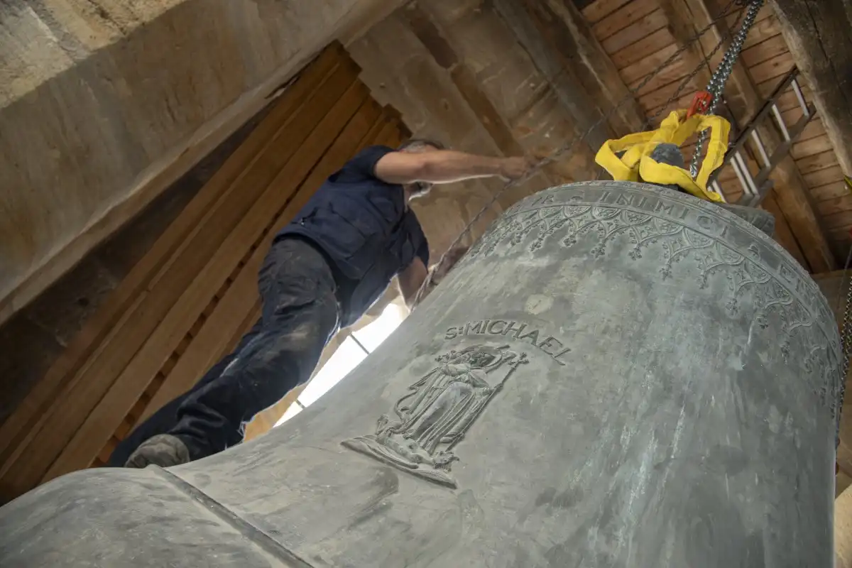 Bildunterschrift: Nr. 1: 1 Die Bestandsglocke mit dem Patrozinium St. Michael von 1614 (Gewicht: 3420kg) wurde neu ausgerichtet.
