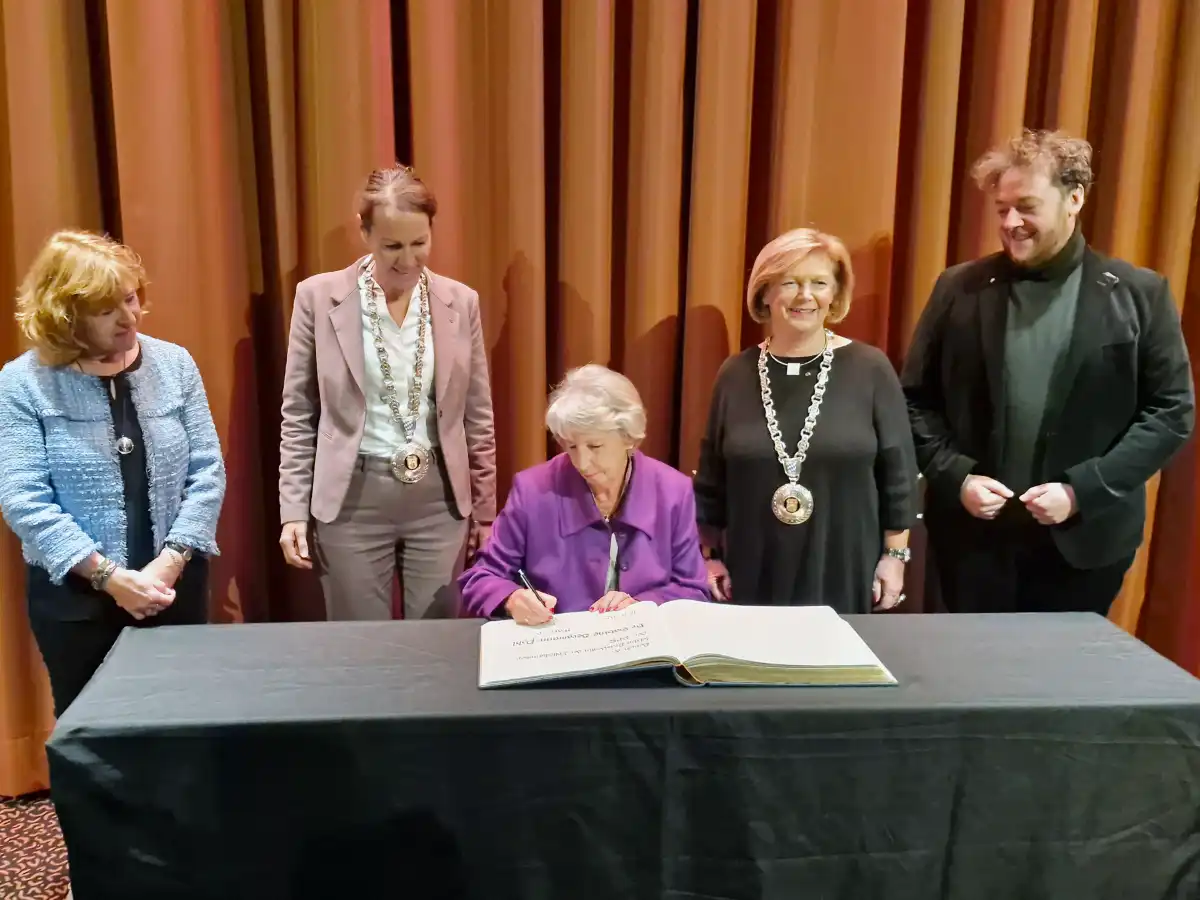 Mit Dr. Sabine Bergmann-Pohl starteten die Deutsch-Deutschen-Filmtage mit einem prominenten Gesicht der Wende in die neue Woche. Die 79-jährige war die letzte Präsidentin der Volkskammer der DDR. Bei ihrem Besuch in Hof beantwortete sie nicht nur die Fragen von Schülerinnen und Schülern, sondern trug sich auch ins Goldene Buch der Stadt ein.