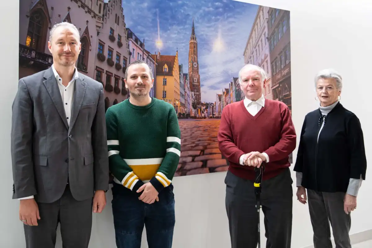 Gemeinsam vor dem großformatigen Bild mit einer Straßenszene aus der Landshuter Innenstadt: v.l. Klinikums-Vorstand André Naumann, Fotograf Attila Geréb, Dr. Franz Josef Knehler und Elke Hüls vom Förderkreis.