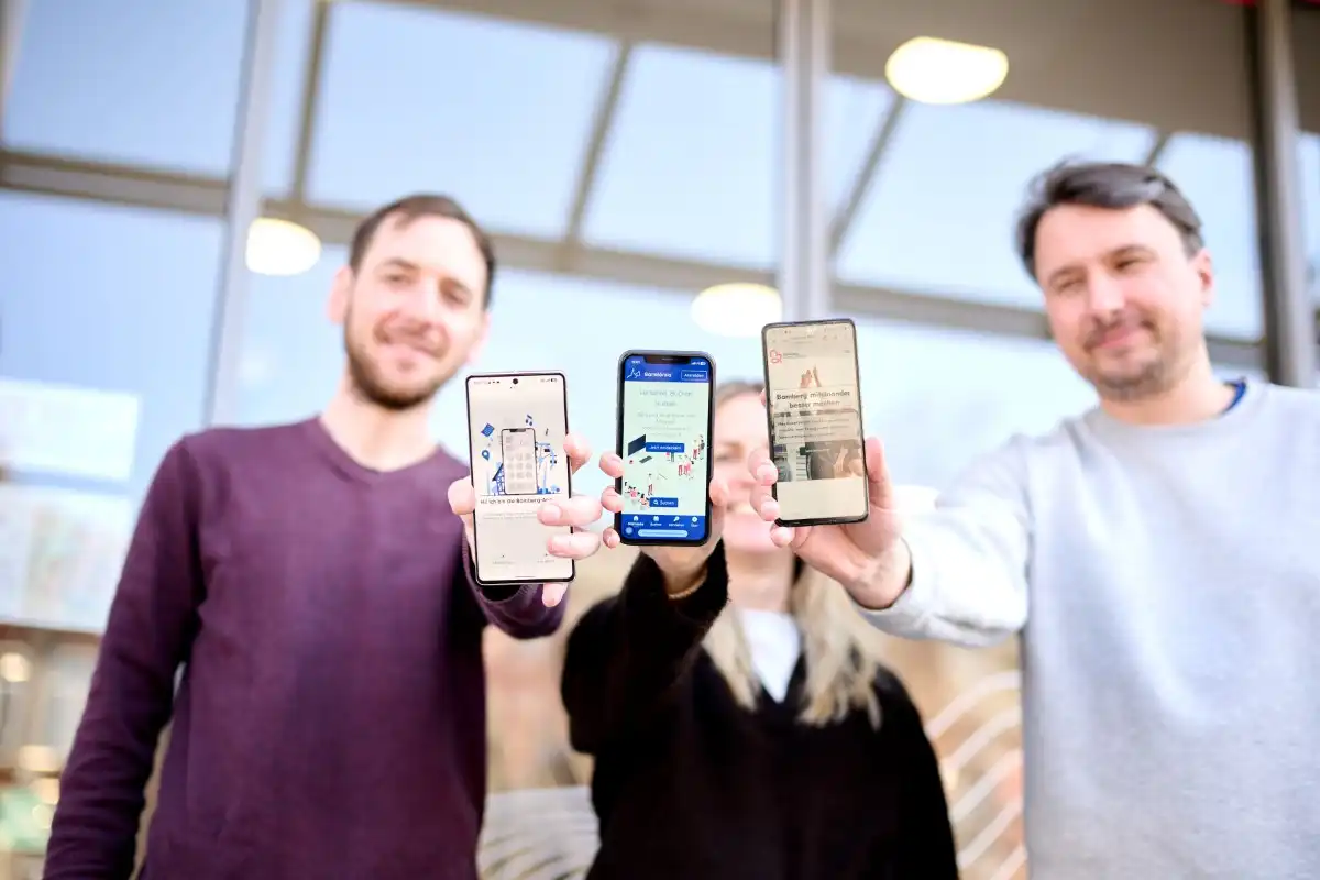 Bildunterschrift: Die drei Projektmanagerinnen und Projektmanager (v.l.) Jonas Behr, Sandra Hennemann und Steve Henschel präsentieren die Anwendungen BamBörsla, Bamberg-App und Bamberg-Miteinander.de