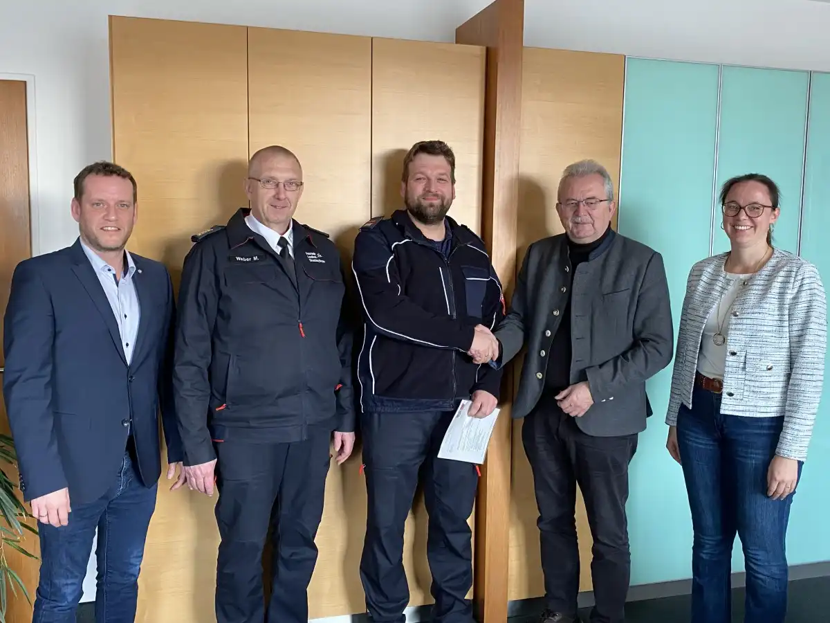 Foto (Foto: Landratsamt/Pressestelle): Jürgen Biermeier (Sachbearbeiter Feuerwehrwesen), Kreisbrandrat Markus Weber, der neue Fachberater Drohne, Franz Sträußl, Landrat Josef Laumer und die zuständige Abteilungsleiterin Stephanie Aumer (von links) bei der Aushändigung der Bestellung im Büro des Landrats.