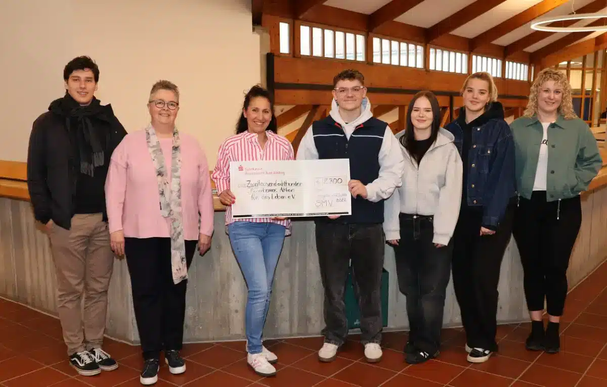 BU: Strahlende Gesichter bei der Spendenübergabe (v.l.n.r.): Thomas Breit (Schülersprecher), OStDin Christiane Elgass (Schulleiterin), Christine Domek-Rußwurm (RO Aktion), Julian Geigenberger (Schülersprecher), Julia Pawlowski und Lilly Graßl (Tagessprecherinnen), StRin Franziska Arnold (Verbindungslehrerin).