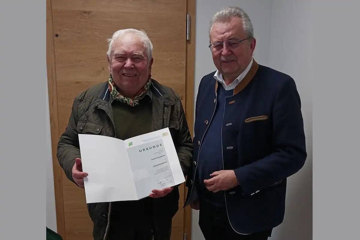 Foto (Foto: Landratsamt/Krämer): Biberberater Xaver Neumeier (links) erhält von Landrat Josef Laumer die Urkunde für mindestens 20-jährige Tätigkeit.