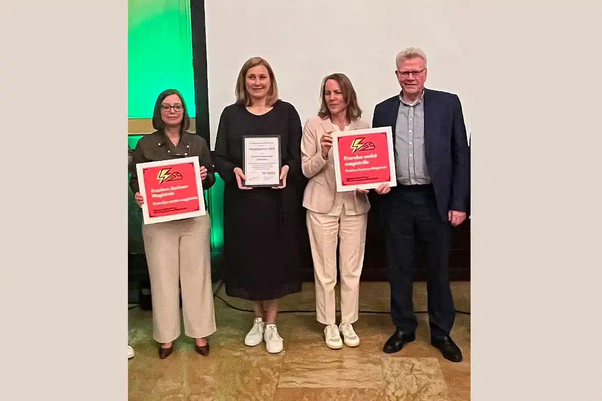 Bildunterschrift: Das Sächsisch-Bayerische Städtenetz ist für sein beharrliches Engagement zur Verbesserung der Bahnanbindung mit dem Fahrgastpreis 2026 ausgezeichnet worden (von links): Laudatorin Yvonne Magwas, Oberbürgermeisterin Constance Arndt (Zwickau), Oberbürgermeisterin Eva Döhla (Hof) und Oberbürgermeister Thomas Ebersberger.